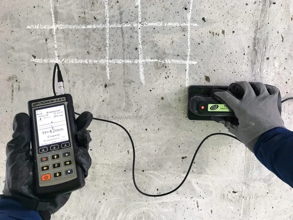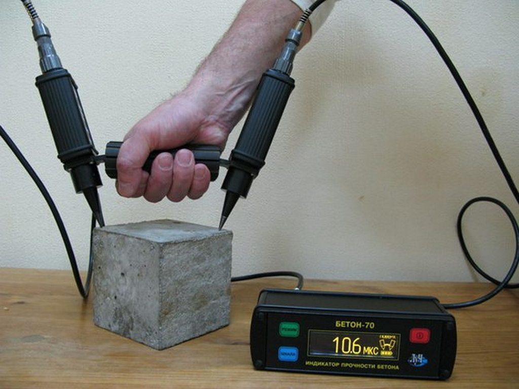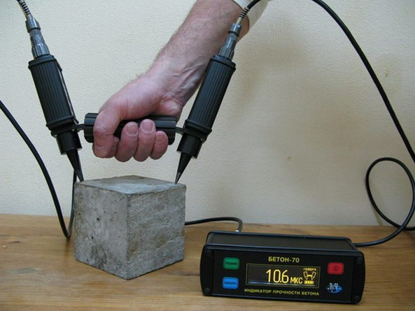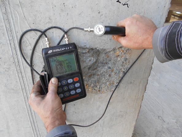 Ультразвуковая диагностика. Через бетон пропускают ультразвук и по его прохождению определяют плотность и наличие внутренних дефектов.
